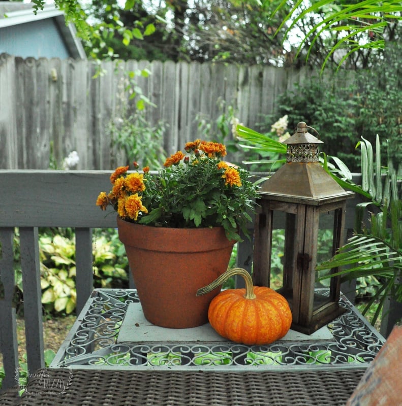 Mixing and matching lanterns and pumpkins is a cozy fall look and can be used indoors and outdoors. If you have room, adding a bench with lanterns also add great textures and interest.