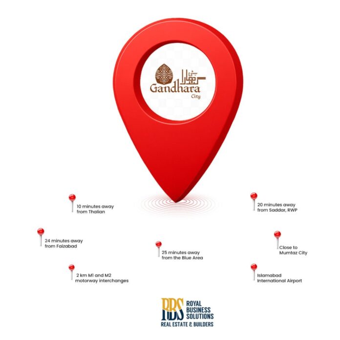 A new residential development called Gandhara City Islamabad is situated between the Islamabad Motorway Link Road and the M-1 Islamabad-Peshawar Motorway. It is close to the New Islamabad International Airport and has a prime location between Islamabad, Rawalpindi, and Fateh Jang Road.