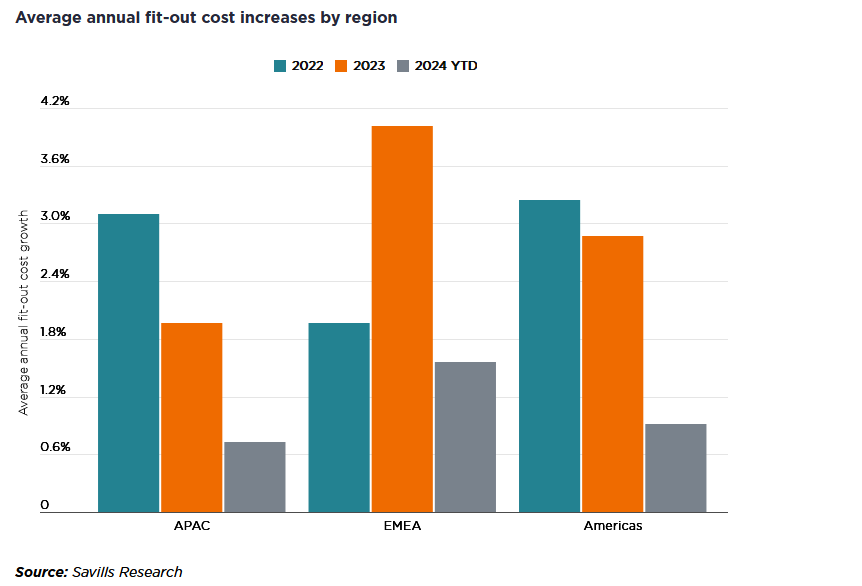 On a global level, the report found that for the first time since the end of the pandemic, office fit-out costs are slowing. Year-to-date increases vary between 0.7 percent and 1.6 percent, well below the increases in 2023 and 2022.