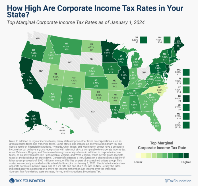 Let’s take a look at the corporate business tax environment across the states. Here is a nice visual made by the Tax Foundation: