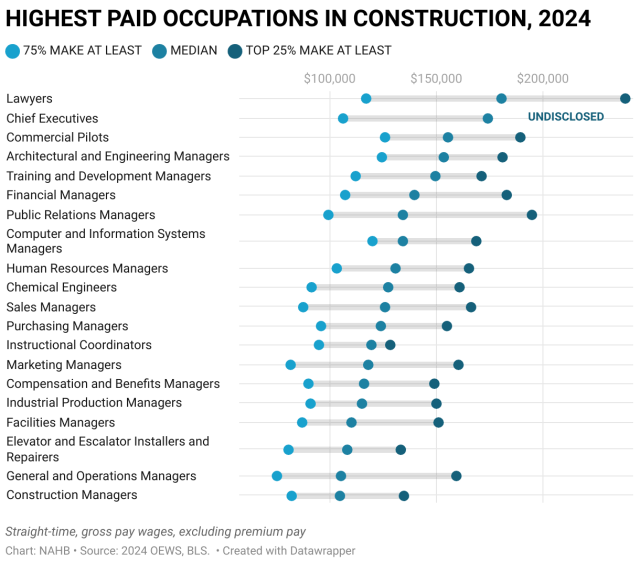 Half of payroll workers in construction earn more than $60,320 and the top 25% make at least $81,510, according to the latest May 2024 Bureau of Labor Statistics Occupational Employment and Wage Statistics (OEWS) and analysis by the National Association of Home Builders (NAHB). In comparison, the U.S. median annual pay is $49,500, while the top quartile (the highest paid 25%) makes at least $78,810.