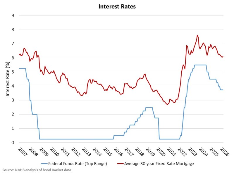 NAHB had forecasted two additional rate cuts for 2026, based on the expectation of modest easing of inflation and a cool labor market. However, consistent with market expectations, our forecast will reduce this to just one rate cut for 2026 due to higher inflation pressure related to headline issues, including increased oil prices due to the Iran war. A longer conflict will have a relatively greater impact on the delay for future Fed rate cuts.
