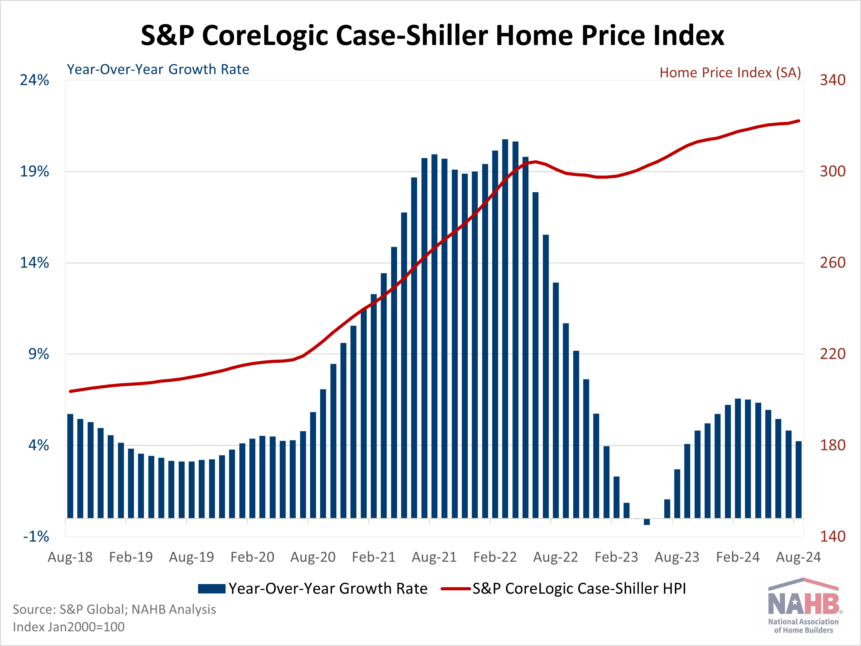 Home price growth continued to slow in August, growing at a rate just above 4% year-over-year. The S&P CoreLogic Case-Shiller Home Price Index (seasonally adjusted – SA) posted a 4.24% annual gain, down from a 4.82% increase in July. Similarly, the Federal Housing Finance Agency Home Price Index (SA) rose 4.25%, down from 4.72% in July. Both indexes experienced a sixth consecutive year-over-year deceleration in August. The year-over-year rate peaked in February 2024 when the S&P CoreLogic Case-Shiller stood at 6.57% and the FHFA at 7.28%.