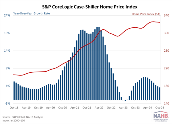 Home price growth continued to slow in October, growing at a rate of 3.60% year-over-year, according to the S&P CoreLogic Case-Shiller Home Price Index (seasonally adjusted – SA). This marks a decline from the 3.90% growth rate recorded in September and represents the seventh consecutive drop in the annual growth rate since reaching a peak of 6.54% in March 2024. As shown in the graph below, the index level has experienced monthly declines since July.