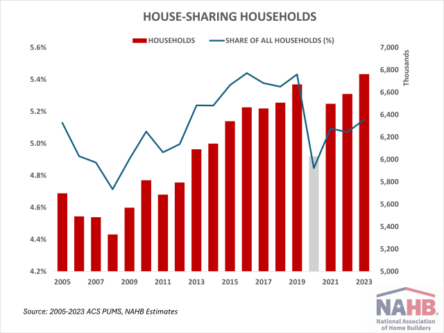 The number of households sharing housing with nonrelatives had been rising steadily since the 2008 housing crash until the COVID-19 pandemic interrupted the upward trend. During that period, the count of households with at least one unrelated member increased from 5.3 million in 2008 to over 6.7 million in 2019. At the same time, the percentage of house-sharing households grew from 4.7% to 5.4%.