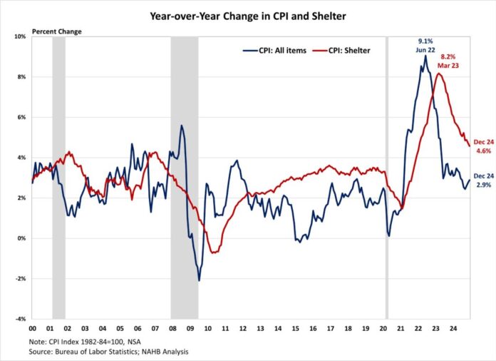 Furthermore, the election result has put inflation back in the spotlight and added additional risks to the economic outlook. Proposed tax cuts and tariffs could increase inflationary pressures, suggesting a more gradual easing cycle with a slightly higher terminal federal funds rate. However, economic growth could also be higher with lower regulatory burdens. Given the housing market’s sensitivity to interest rates, a higher inflation path could extend the affordability crisis and constrain housing supply as builders continue to grapple with lingering supply chain challenges. During the past twelve months, on a non-seasonally adjusted basis, the Consumer Price Index rose by 2.9% in December, according to the Bureau of Labor Statistics’ report. This followed a 2.7% year-over-year increase in November. Excluding the volatile food and energy components, the “core” CPI increased by 3.2% over the past twelve months, after holding steady at 3.3% for three months. The component index of food rose by 2.5%, while the energy component index fell by 0.5%.