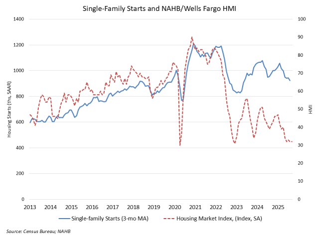 The multifamily sector, which includes apartment buildings and condos, decreased 11.7% to an annualized 417,000 pace. While apartment construction has declined in 2025 in larger population metropolitan areas, the apartment development sector has been solid in lower density areas including some exurban locations, per tracking from the NAHB Home Building Geography Index.