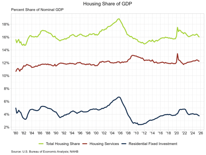 Housing’s share of the economy was 16.0% in the fourth quarter of 2025, according to the latest estimates of GDP produced by the Bureau of Economic Analysis. This share is down from 16.1% in the third quarter and is also lower than 16.3% as registered just one year ago. Residential construction, measured by residential fixed investment, subtracted from real GDP growth for each quarter in 2025, replicating a trend from 2022.