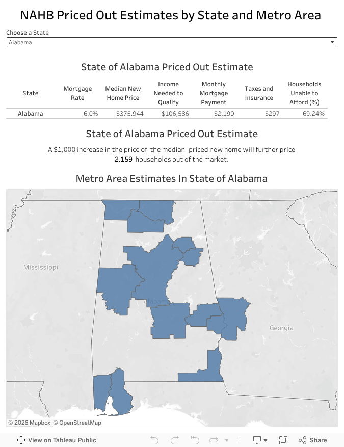 The NAHB 2026 priced-out estimates show that the housing affordability challenge is widespread across the country. In 39 states and the District of Columbia, over 65% of households are priced out of the median-priced new home market. This indicates a significant disconnect between higher new home prices, elevated mortgage rates, and household incomes.