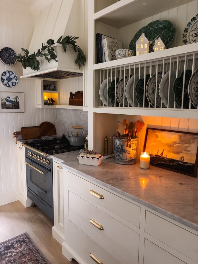 For my stove hood garland I bought these hooks that have a sticky back. I put one hook on each side of the hood on the flat ledge (although you could put it anywhere depending on the style of your hood). I’ve done this for the past two years and it has worked perfectly!