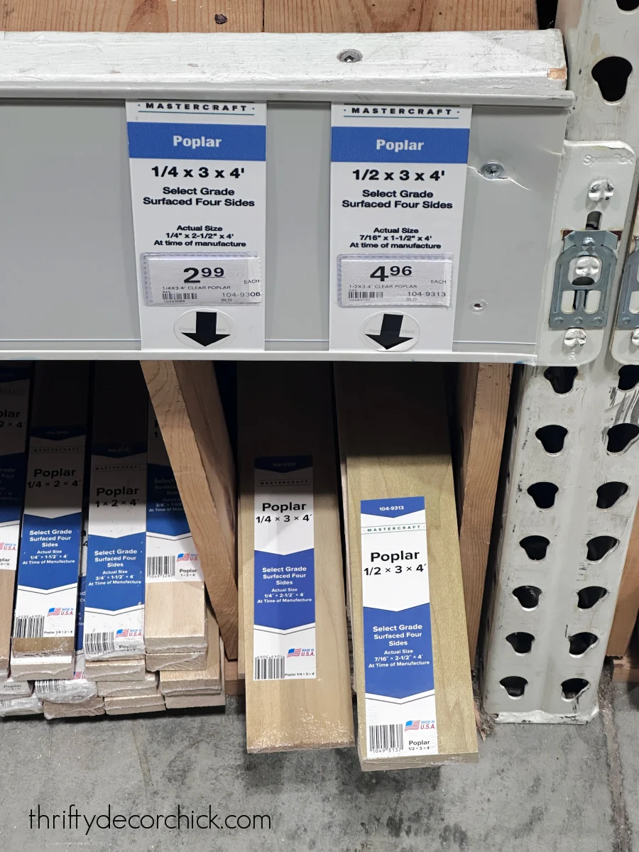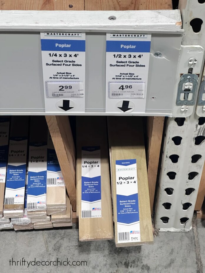 I’ve found these particular boards at both Home Depot and Menards (pictured above) — I can’t find any in the quarter inch thickness at Lowe’s.