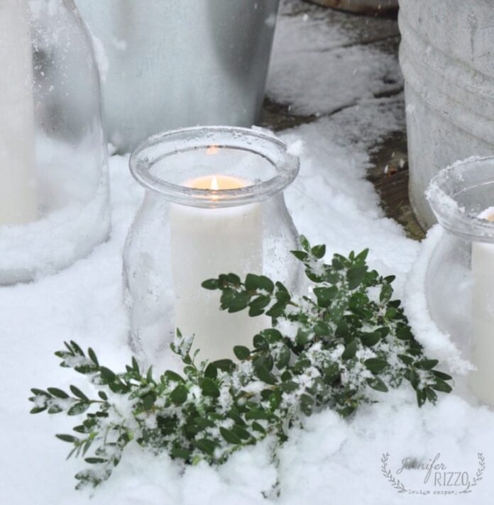 A white candle in a glass holder sits on snow beside green leafy branches, creating a cozy holiday outdoor scene with snow-covered metal containers in the background.