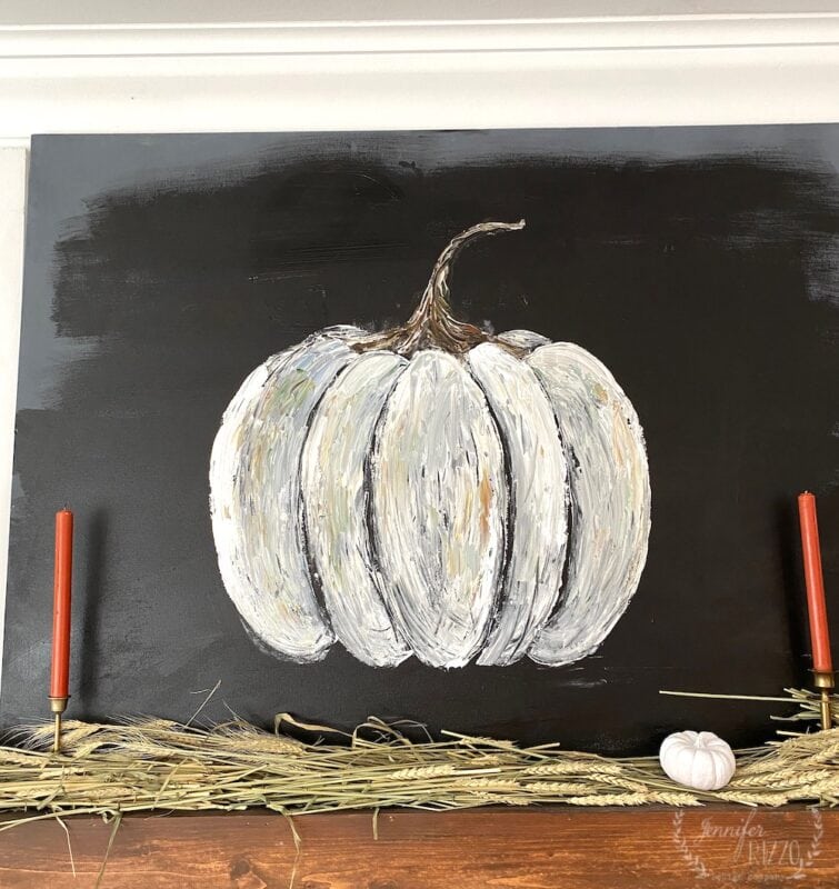 Welcome! This is part 3 of how to paint a rustic pumpkin canvas with a palette knife. It’s pumpkin season!  This video  with a step-by-step tutorial below shows you how to paint a pumpkin stem with a palette knife after you’ve painted the pumpkin. See how to do that here. You can find the original post linked below that also has the supply list and the video tutorial. This is a great tutorial for beginners and can be used to paint short or long stems. You might wonder what color should a pumpkin stem be? It depends if you want your stem to appear more dried out and rustic, or fresh picked off of the vine. The pumpkins in the grocery store tend to be a little more dried out and on the brown side. Pumpkins from a pumpkin patch or farm might be more recently picked and still have a green cast to them.  This tutorial is for painting  a more dried out looking pumpkin stem with paint textures, but t can also be used to paint more of a green stem by swapping about the same tone of paints in green tones. This is painted on a white pumpkin, but can be used for any color pumpkin canvas painting.