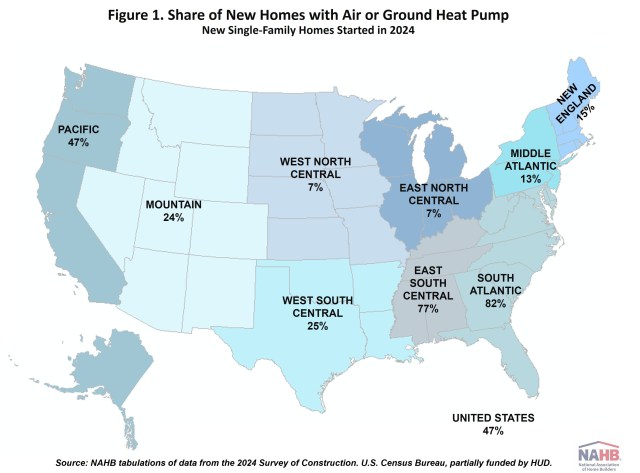 Almost all of new single-family homes started in 2024 used either an air/ground source heat pump or a forced air system for the primary heating equipment (97%), according to the Census’s Survey of Construction. Additionally, 20% percent of homes also used a secondary type of heating equipment.