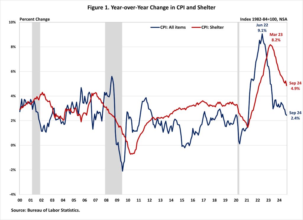 Inflation continued to ease in September and remained at a 3-year low as shelter costs continued to moderate. Shelter costs, the main driver of inflation since early 2023, saw their annual growth rate fall below 5% for the first time since February 2022. With the Fed beginning its easing cycle with a half-point cut last month, lower interest rates could help ease some pressure on the housing market.