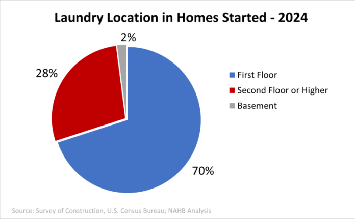 In 2024, most new single-family homes included laundry connections on the first floor (70%), according to the Census Bureau’s Survey of Construction. The first floor is also where most customers prefer to have the laundry, as shown in Chapter 2 of What Home Buyers Really Want.