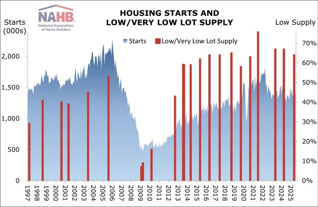 Although shortages are not quite as widespread as they were in 2021, obtaining lots remains a challenge for many builders, according to recent results from the NAHB/Wells Fargo Housing Market Index (HMI) survey.  In special questions on the May 2025 HMI survey, 38% of single-family builders characterized the supply of lots as low, and another 26% said it was very low, for a total of 64% reporting some type of shortage. This is down slightly from the 67% reported in both 2023 and 2024, and down significantly from the peak of 76% in 2021 (a year after the COVID-19 outbreak). Nevertheless, at 64% the shortage percentage is higher than it had been at any time between 1997 (when NAHB first began tracking the number) and 2016.