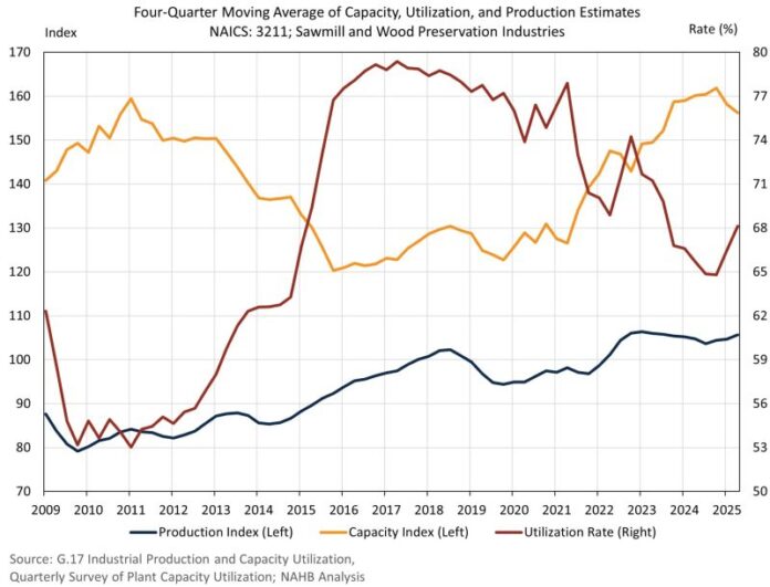 The sawmill utilization rate is a ratio of actual production and potential full production that is released quarterly by the Census Bureau. The utilization rate has experienced an overall downward trend since 2017 as a result of added capacity, yet stagnant production. However, the second quarter of 2025, on a four-quarter moving average, experienced a slight uptick from 66.5% to 68.1%. Meanwhile, sawmill production, based on a four-quarter moving average, is 0.9% higher in the second quarter of 2025 compared to the first quarter. However, sawmill production remains just 0.3% above 2023 levels.