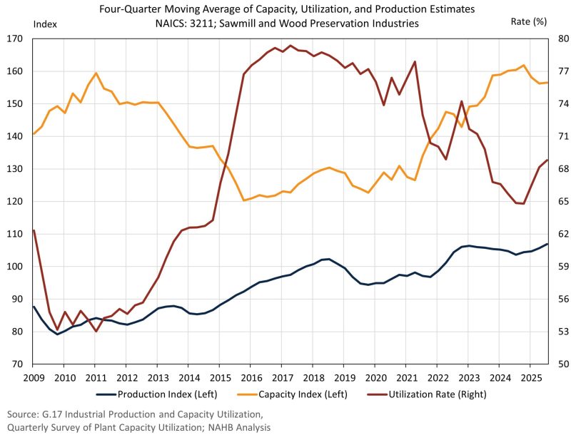 The sawmill utilization rate, a measure of actual production relative to potential full production published quarterly by the Census Bureau, has trended downward since 2017 due to added capacity and stagnant output. However, in the third quarter of 2025, on a four-quarter moving average, the utilization rate rose, as it increased from 68.2% to 68.8%. Meanwhile, sawmill production, based on a four-quarter moving average, was 1.2% higher in the third quarter of 2025 compared to the second quarter and was 3.1% higher than a year ago.