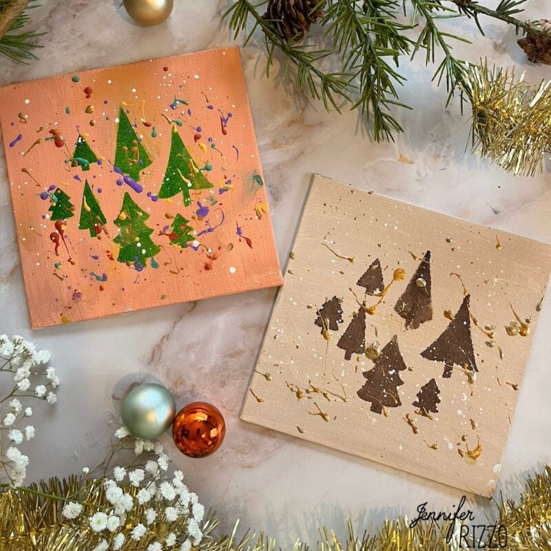 Two square paintings of abstract Christmas trees in green and brown tones with paint splatters. Surrounded by holiday decorations and foliage on a marble surface.
