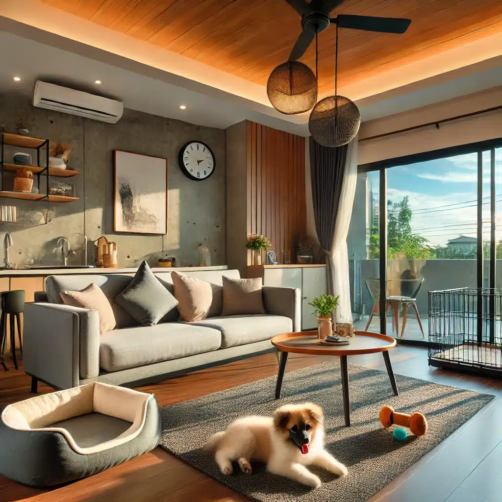 Modern living room with pet-friendly furnishings and a pet bed.Modern living room with pet-friendly furnishings and a pet bed.
