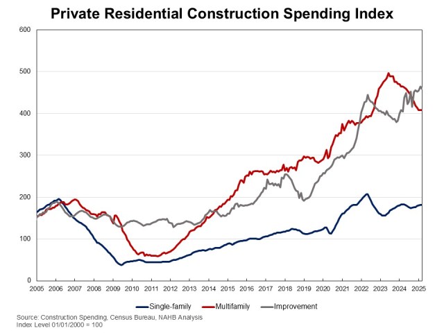 According to the latest U.S Census Construction Spending data, improvement spending declined by 1.2% in March, aligned with the weakness in the Remodeling Market Sentiment of the first quarter of 2025. Still, spending on improvements was 13.4% higher than in March of 2024. Meanwhile, spending on single-family construction edged up by 0.1% in March, continuing its growth after a five-month decline from April to August 2024. However, single-family construction spending remained 0.8% lower than a year ago. Multifamily construction spending stayed unchanged in March, staying in the downward trends that began in December 2023. Compared to March 2024, it was down 12.1%.