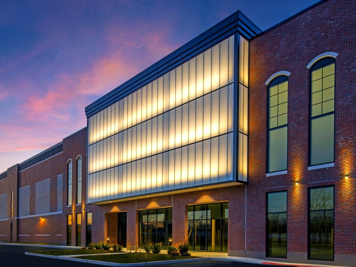 The developer acquired the 12-acre parcel in 2022 and built the facility on speculative basis. A brick facade and black window mullions inspired by the original industrial property pair with large, translucent light boxes in a design that is new, but also plays tribute to the former factory.