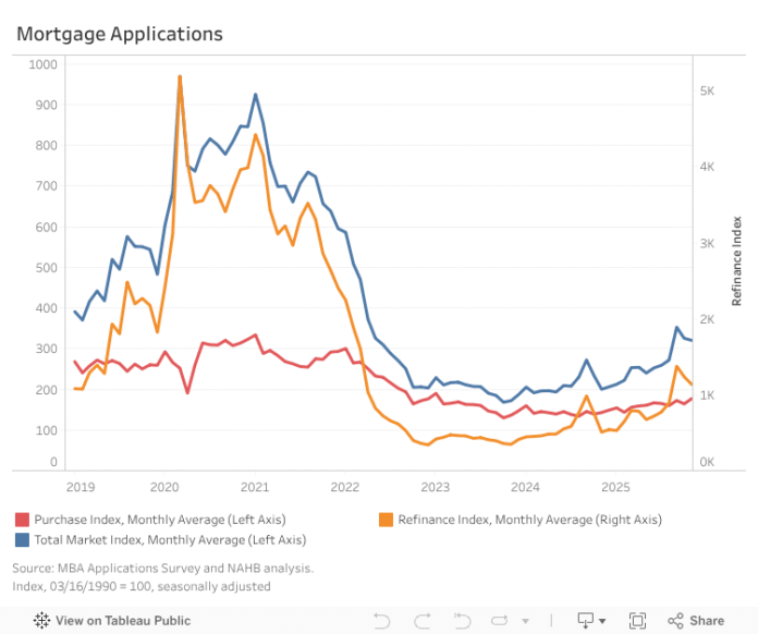The Mortgage Bankers Association’s (MBA) Market Composite Index, a measure of total mortgage application volume, fell 1.6% from October on a seasonally adjusted basis but was 60% higher than a year ago.