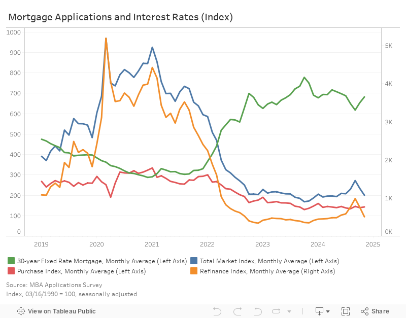The market decline was reflected primarily in the Refinance Index (SA), which decreased by 33.2% month-over-month. Meanwhile, the Purchase Index (SA) showed a modest increase of 2.7% over the same period. However, compared to October 2023, the Market Composite Index is up by 16.4%, with the Purchase Index seeing a slight 4.8% increase and the Refinance Index higher by 45.9%.