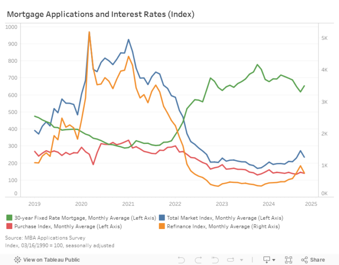 The Market Composite Index, a measure of mortgage loan application volume by the Mortgage Bankers Association’s (MBA) weekly survey, decreased 13.9% month-over-month on a seasonally adjusted (SA) basis due to higher mortgage rates. This decline was reflected in both the Purchase and Refinance Indices, which fell by 4.4% and 23%, respectively. However, compared to October 2023, the Market Composite Index is up by 39%, with the Purchase Index seeing a slight 1.9% increase and the Refinance Index higher by 149.9%.