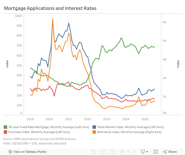 Mortgage application activity picked up in July as interest rates eased modestly. The Mortgage Bankers Association’s (MBA) Market Composite Index, which tracks mortgage application volume, rose 2.4% from June on a seasonally adjusted basis. Compared to July 2024, total applications were up 24.5%.