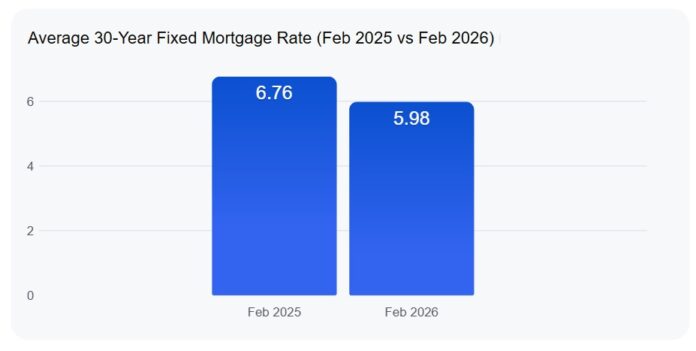 According to data from Freddie Mac, the average 30-year fixed mortgage rate has specifically fallen from 6.76% in February 2025 to 5.98% as of February 26, 2026. This is a substantial shift and marks a significant psychological victory for the market.