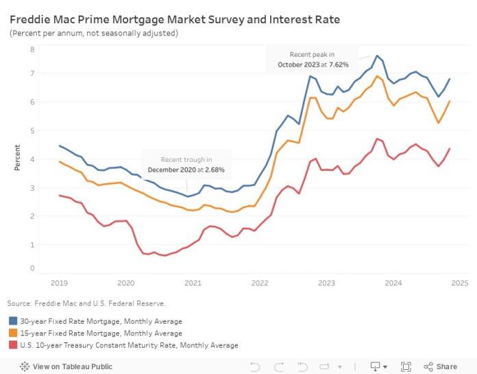 According to Freddie Mac, the average rate for a 30-year fixed-rate mortgage increased 38 basis points from October, reaching 6.81%. Meanwhile, the 15-year fixed-rate mortgage saw an even steeper increase of 43 bps to land at 6.03%.