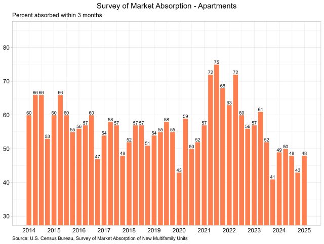 The percentage of new apartment units that were absorbed within three months after completion rose in the second quarter, according to the Census Bureau’s latest release of the Survey of Market Absorption of New Multifamily Units (SOMA). The survey covers new units in multifamily residential buildings with five or more units. The number of new multifamily units completed fell for the second consecutive quarter, down to the lowest level since the fourth quarter of 2023.