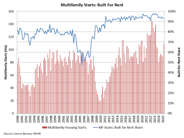 According to NAHB analysis of quarterly Census data, the count of multifamily, for-rent housing starts increased during the second quarter of 2025. For the quarter, 109,000 multifamily residences started construction. Of this total, 102,000 were built-for-rent. This built-for-rent total was 21% higher than the second quarter of 2024.