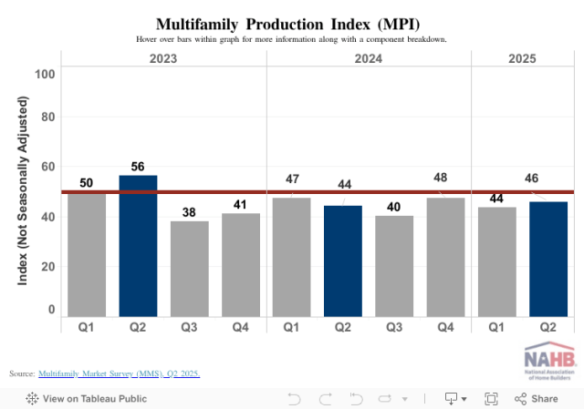 Confidence in the market increased for multifamily developers in the second quarter of 2025, according to the Multifamily Market Survey (MMS) released today by the National Association of Home Builders (NAHB). The MMS produces two separate indices. The Multifamily Production Index (MPI) was up two points year-over-year to 46. The Multifamily Occupancy Index (MOI) had a reading of 82, up one point year-over-year.