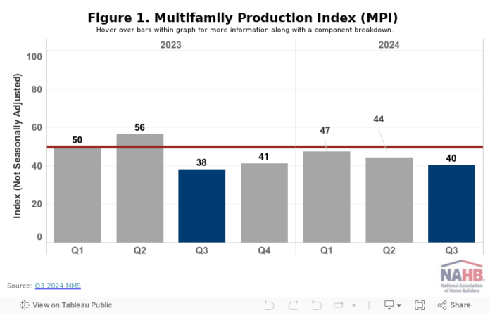 Confidence in the market for new multifamily housing showed mixed results year-over-year in the third quarter of 2024, according to results from the Multifamily Market Survey (MMS) released today by the National Association of Home Builders (NAHB). The MMS produces two separate indices: the Multifamily Production Index (MPI) had a reading of 40, an increase of two points year-over-year, while the Multifamily Occupancy Index (MOI) had a reading of 75, down seven points year-over-year.