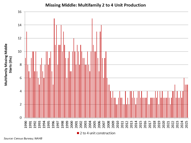 The multifamily segment of the missing middle (apartments in 2- to 4-unit properties) has generally disappointed since the Great Recession. For the second quarter of 2025, there were 5,000 2- to 4-unit housing unit construction starts. This represents a small increase relative to the second quarter of 2024.