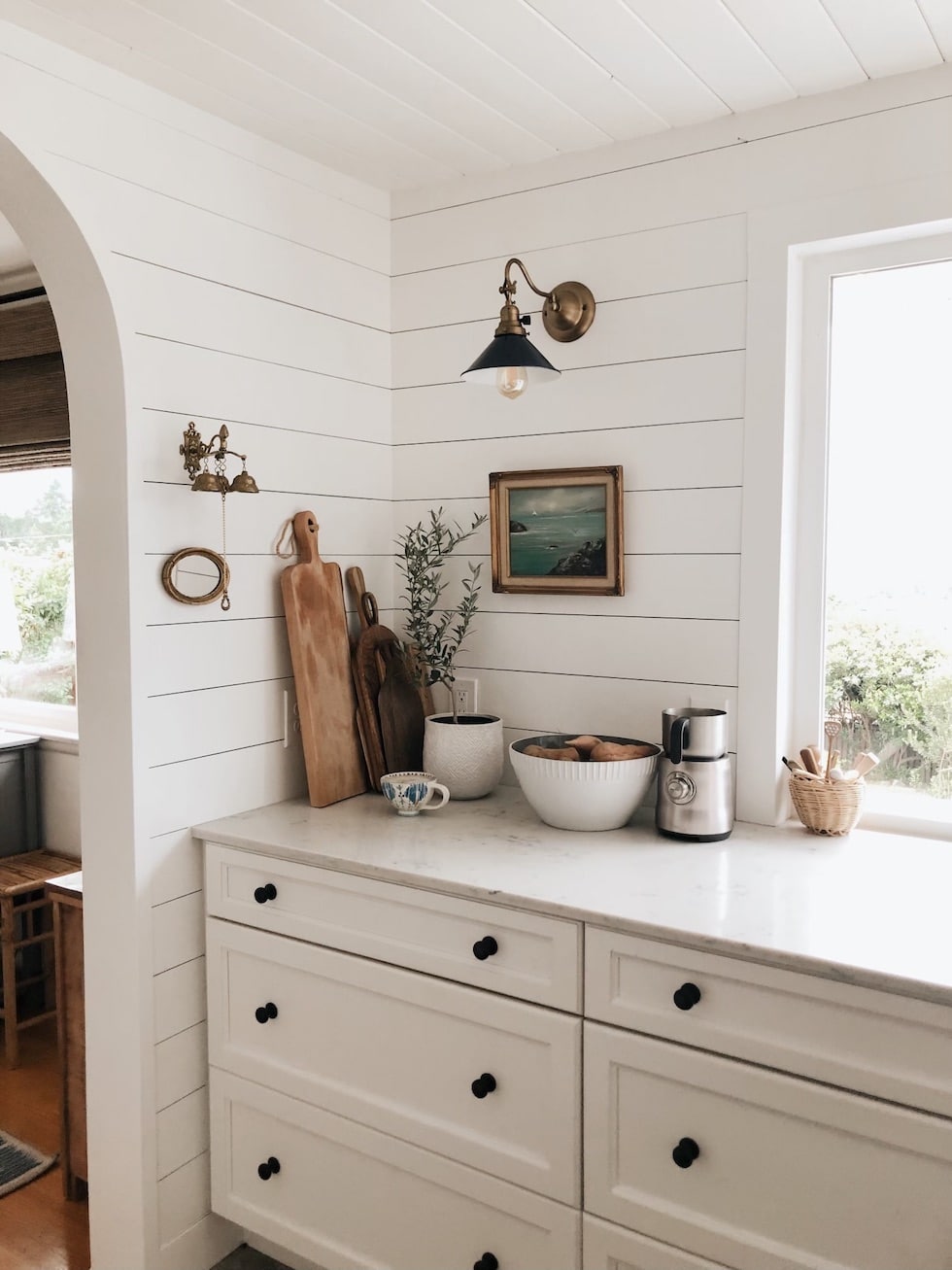 This is my coffee station cabinet, it’s here I keep our (affordable!) espresso maker and a lot of our supplies and mugs. This is a post on the peel and stick wallpaper I used here as well as a peek at where we keep our water filter! Filtered water is ESSENTIAL for the best tasting coffee (in my opinion).