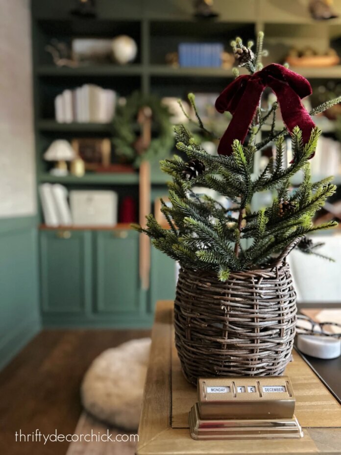 This small faux tree was in a boring pot that I didn’t love, so I decided to pull it out of the planter it came in and plopped it into a basket I had: