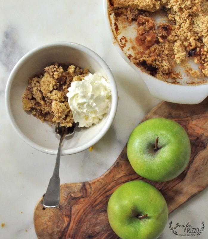 Fall is prime apples season so it seems a shame not to take advantage of it with all of the wonderful varieties out there! I know I boasted earlier that my MIL made the most amazing apple crumble (apple crisp). It’s so true! It has sweet and slightly spicy apples and a yummy crumble topping. If you’ve never made one, it’s really easy, almost like am upside down pie with a crispy, sweet top. I love making this apple crumble recipe as the temperature dips and the leaves start turning. Not only is it delicious, but it makes our home smell amazing. You know how I am about loving fall scents!