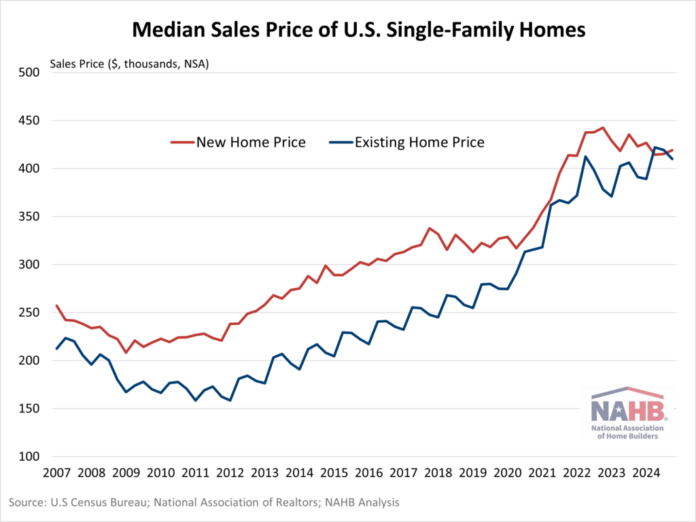 The traditional price gap between new and existing homes was nearly nonexistent at the end of 2024. The median price for a new single-family home sold in the fourth quarter of 2024 was $419,200, a mere $9,100 above the existing home sales price of $410,100, according to U.S. Census Bureau and National Association of Realtors data (not seasonally adjusted – NSA).
