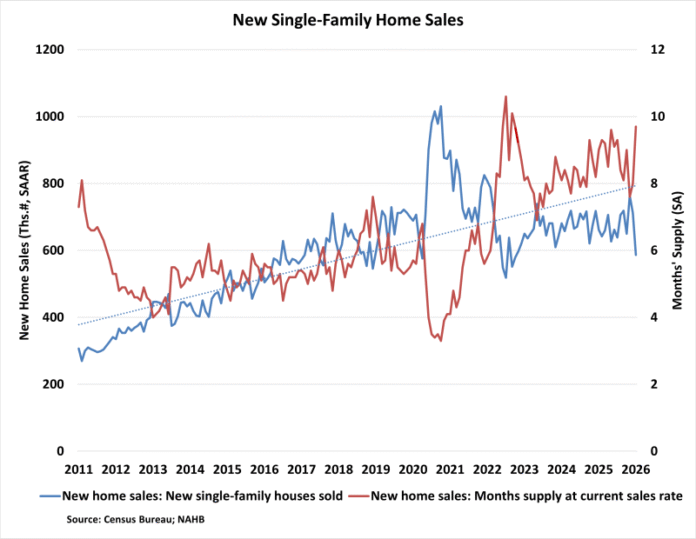 Sales of newly built single-family homes fell 17.6% in January to a seasonally adjusted annual rate of 587,000 from a downwardly revised December reading, according to newly released data from the U.S. Department of Housing and Urban Development and the U.S. Census Bureau. The pace of new home sales is down 11.3% from a year earlier. On a three-month moving average basis, sales were 688,000, remaining broadly in line with the 685,000 pace seen a year ago.