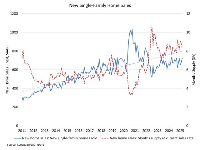 A new home sale occurs when a sales contract is signed, or a deposit is accepted. The home can be in any stage of construction: not yet started, under construction or completed. In addition to adjusting for seasonal effects, the March reading of 724,000 units is the number of homes that would sell if this pace continued for the next 12 months.