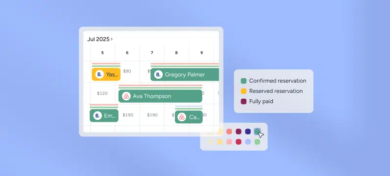 Pro tip: Use custom colors to create your own visual system. Assign bright colors to unpaid reservations so they stand out immediately, use distinct colors for owner blocks to track their usage at a glance, and color-code channel-specific reservations to quickly identify your highest-performing distribution sources.