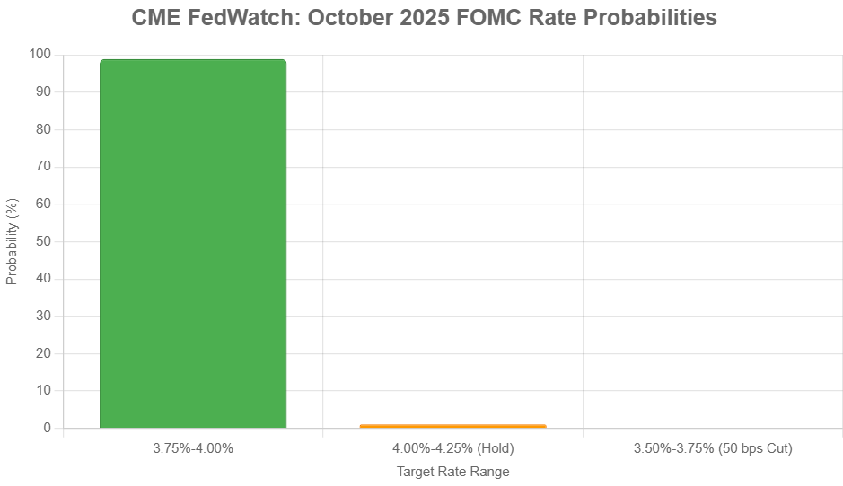 When it comes to what the financial markets expect, there’s very little guesswork. The CME FedWatch Tool, which tracks futures contracts related to the federal funds rate, shows an overwhelming probability – around 98.9% – of a 25 basis point (bps) cut. This means the market is virtually certain that the Fed will lower its target rate from the current 4.00%-4.25% range to 3.75%-4.00%. The odds of no change are barely 1.1%, and a larger 50 bps cut is, for all intents and purposes, off the table.