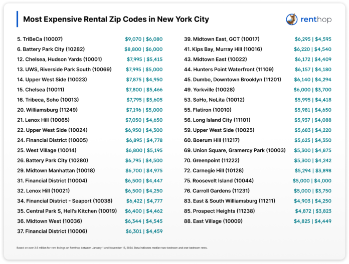 New York City retained its title for having the most zip codes with the highest median rent in the United States in 2024, according to a report by the real estate firm RentHop.