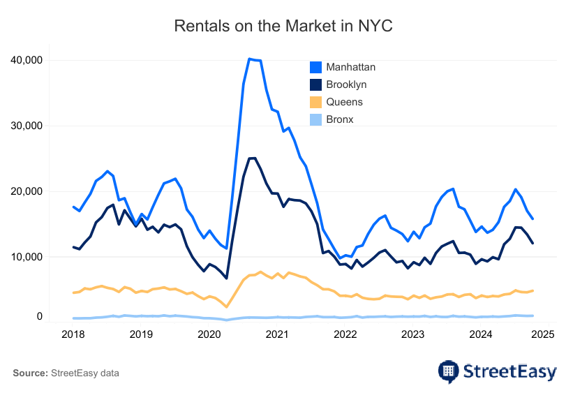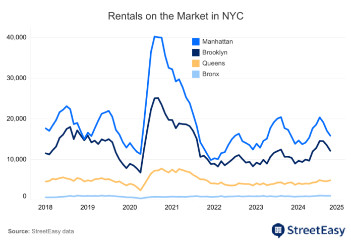 Thanks to the rising inventory giving renters more options to consider, concessions are becoming more common in an effort to make certain listings stand out. This is especially true in Queens, where 19.5% of its rentals in October 2024 were offered with at least one month of free rent.
