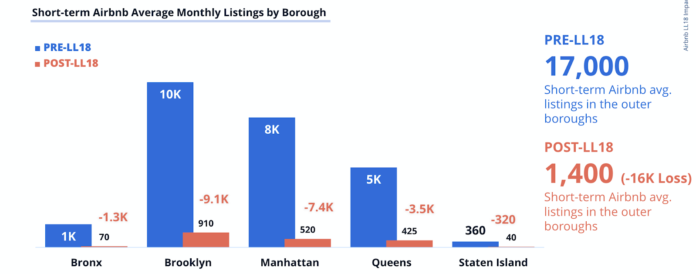 Airbnb partnered with HR&A Advisors to release compelling data showing the economic impact of Local Law 18. Their research revealed that STR listings in outer boroughs like Brooklyn and Queens plummeted from 17,000 to just 1,400, leading to $1.6 billion in lost visitor spending and 15,700 fewer jobs. These figures illustrated how the law hurt local economies without solving housing issues.
