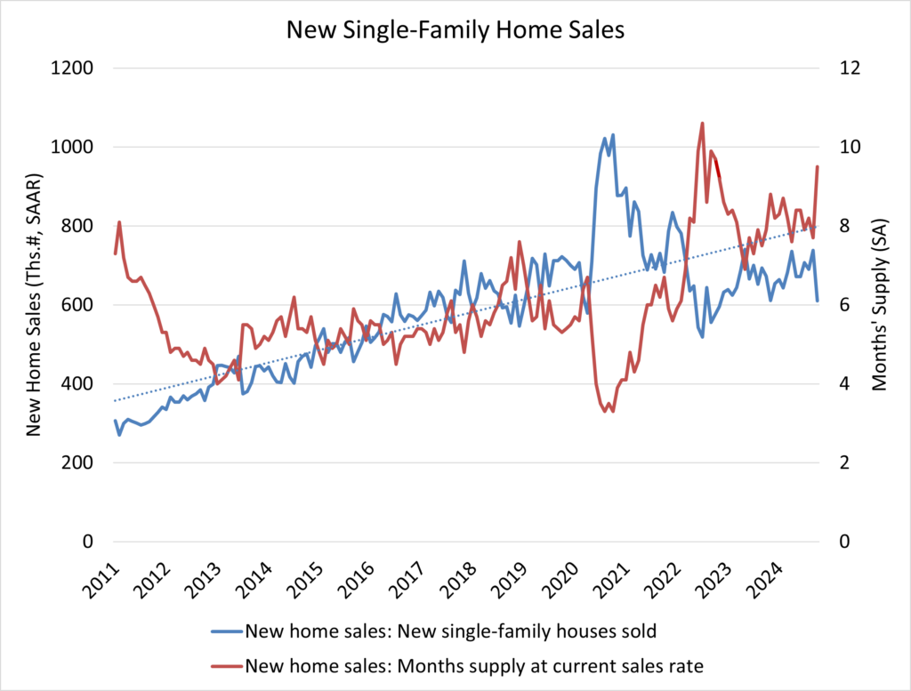 New single-family home inventory in October remained elevated at a level of 481,000, up 8.8% compared to a year earlier. This represents a 9.5 months’ supply at the current sales pace. A measure near a six months’ supply is considered balanced.